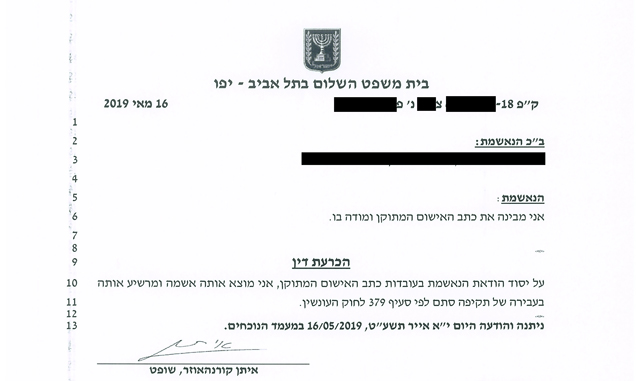 במהלך דיון שמיעת הראיות בתיק, הנאשמת בחרה להודות במעשיה בפני כב' השופט איתן קורנהאוזר ומשכך בית משפט השלום בתל אביב מצא אותה אשמה בעבירות שיוחסו לה בכתב האישום.