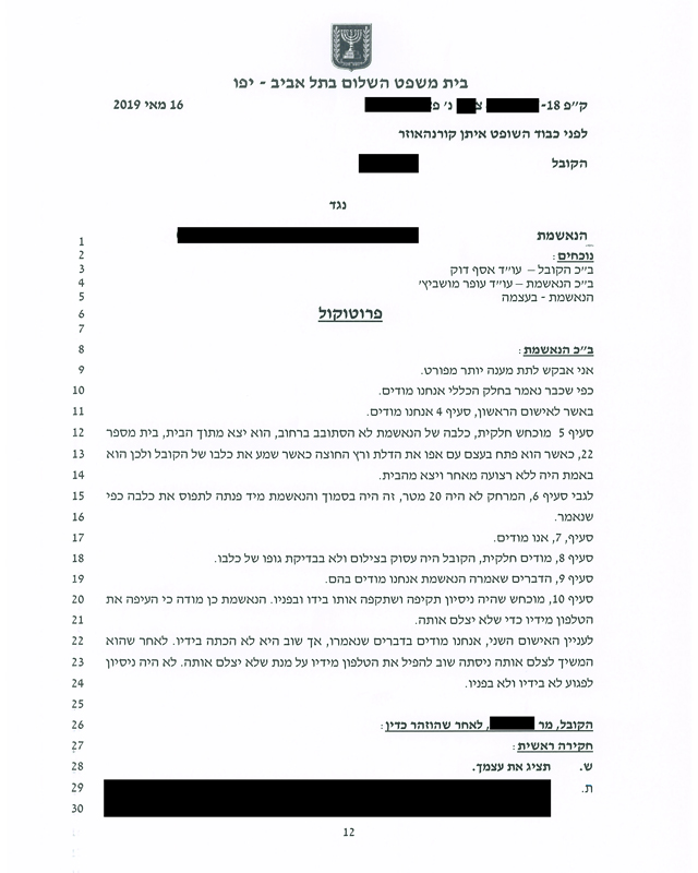 להלן העתק חלקי מפרוטוקול החלטת בית משפט השלום בתל אביב בדבר הרשעתה של הנאשמת בתקיפת לקוח משרדנו. מפאת החיסיון והשמירה על פרטיותו של הלקוח פרטיו המזהים ופרטים נוספים במסמכים הושמטו: