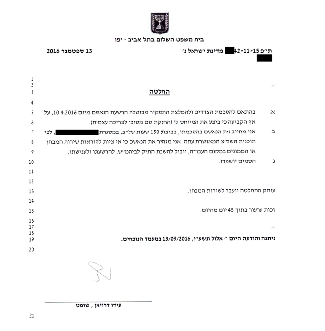 כב' השופט עידו דרויאן מצא לנכון לכבד את ההסדר בהיותו סביר ומאזן נכונה בין האינטרס הציבורי לאינטרס האישי של הנאשם.