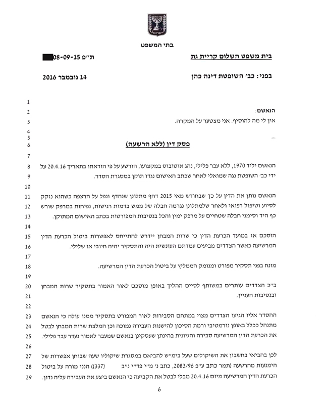 להלן העתק פסק הדין שניתן בעניינו של הלקוח. מפאת החיסיון והשמירה על פרטיותו, פרטיו המזהים ומידע חסוי אחר הושמטו: