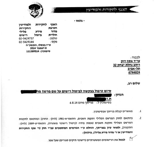 - דוגמא לתשובת מדור מידע פלילי במטה הארצי בדבר ביטול הרישומים המשטרתיים (רישומי תיקים סגורים) בתיק לקוח: