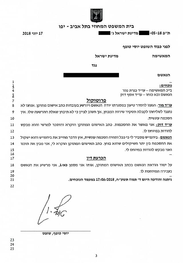 פרוטוקול בית המשפט בדבר קבלת הסדר הטיעון המקל עם הלקוח: