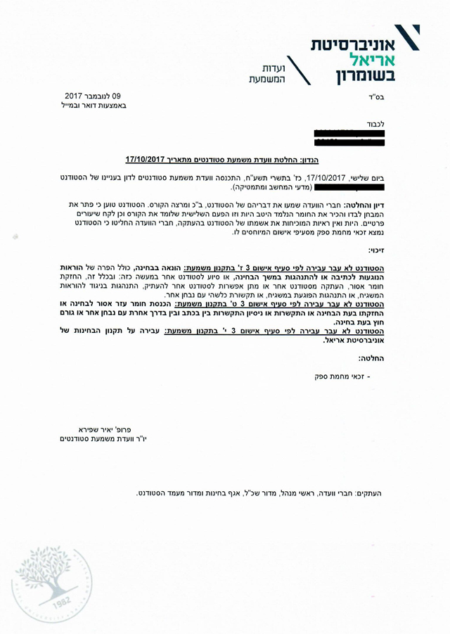 להלן העתק פסק הדין של ועדת המשמעת באוניברסיטת אריאל שניתן בעניינו של לקוח המשרד. מפאת החיסיון והשמירה על פרטיותו של הסטודנט פרטיו המזהים ופרטים נוספים במסמך הושמטו: