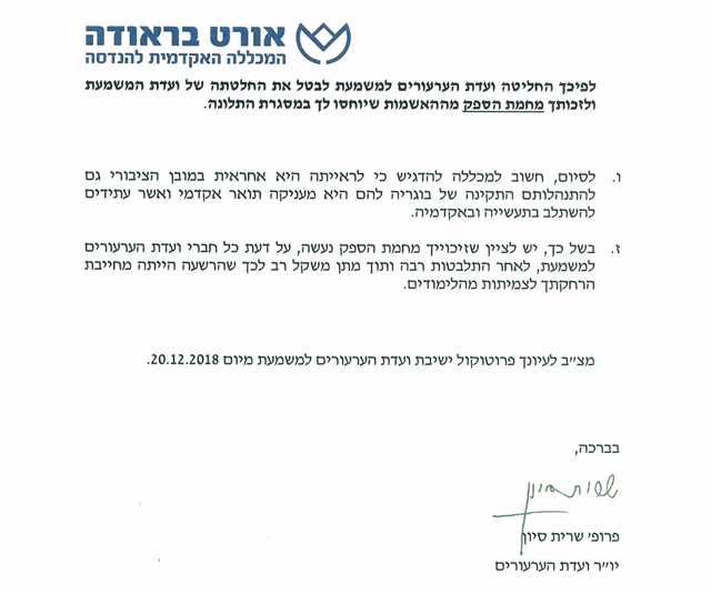 ביטול קובלנה משמעתית לסטודנטית למשפטים במכללת ספיר שהואשמה בהונאה בעבודה סמינריונית
