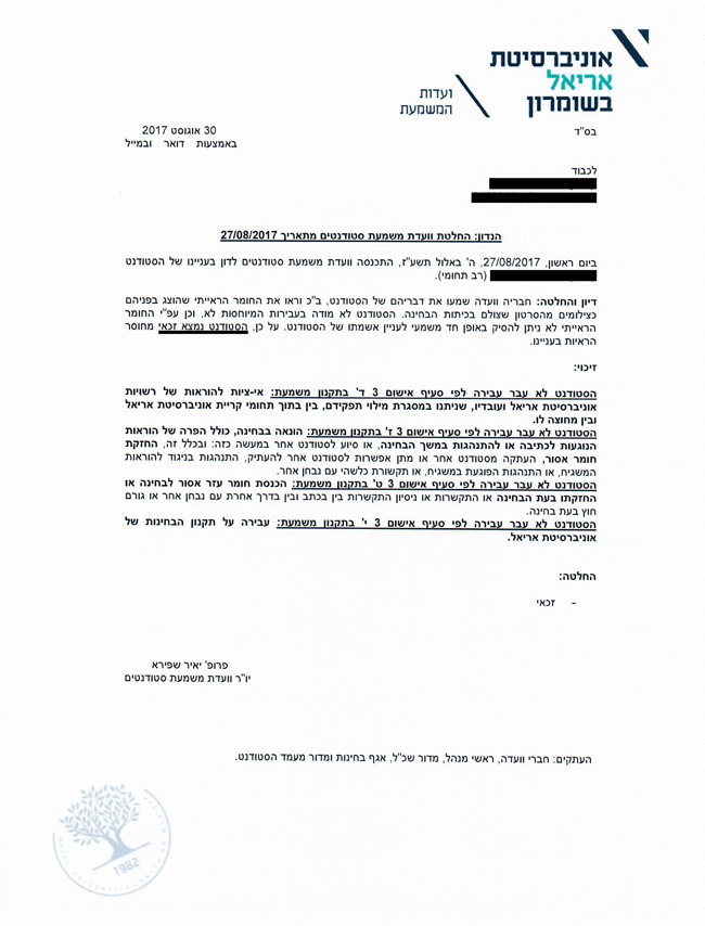 להלן העתק פסק הדין של ועדת המשמעת באוניברסיטת אריאל שניתן בעניינו של לקוח המשרד. מפאת החיסיון והשמירה על פרטיותו של הסטודנט פרטיו המזהים ופרטים נוספים במסמך הושמטו: