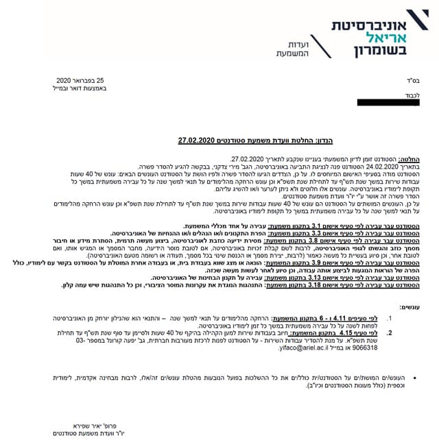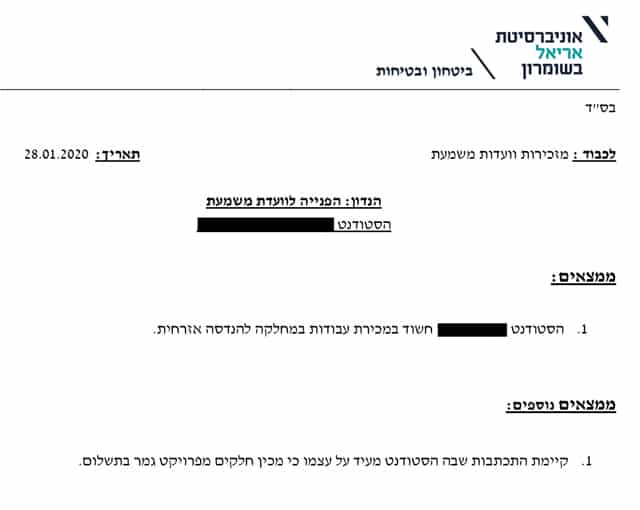 להלן העתק מהתלונה שהוגשה נגד הסטודנט והחלטת ועדת המשמעת באוניברסיטת אריאל בעניינו. מפאת החיסיון והשמירה על פרטיותו, פרטיו המזהים ומידע חסוי אחר הושמטו: