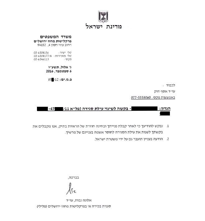 בעקבות הגשת הערר ואיסוף הראיות על ידנו, הוחלט בפרקליטות ירושלים לשקול מחדש ובחיוב את בקשתנו בדבר שינוי עילת הסגירה בתיק וזאת אכן שונתה לחוסר אשמה פלילית, כאשר מהבחינה הפרקטית כאמור התוצאה לשמחתם הרבה של לקוחות משרדנו הינה מחיקת התיק מרישומי המשטרה לאלתר.