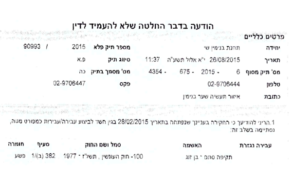להלן העתק הודעת המשטרה שנשלחה למשרדנו בעניינה של הלקוחה. מפאת החיסיון והשמירה על פרטיותה, פרטיה המזהים הושמטו: