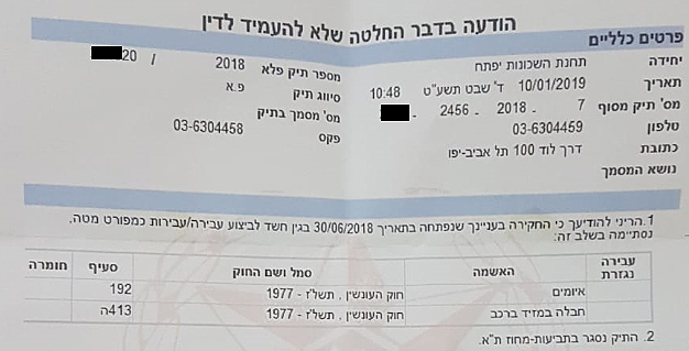 להלן העתק הודעת מדור תביעות תל אביב בעניינה של הלקוחה. מפאת החיסיון והשמירה על פרטיותה פרטיה המזהים במסמך הושמטו: