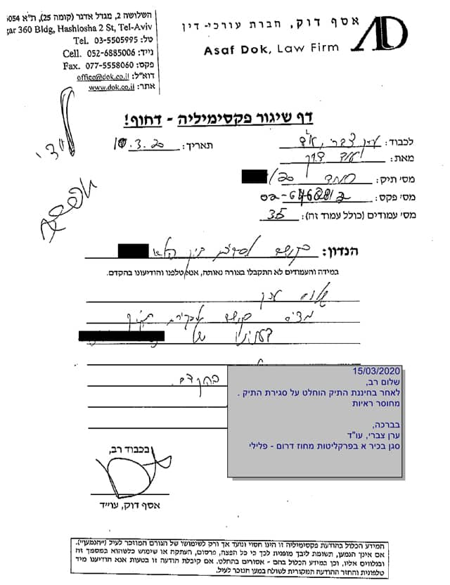 להלן העתק הודעת פרקליטות דרום בדבר סגירת התיק נגד הלקוח. מפאת החיסיון והשמירה על פרטיותו פרטיו המזהים במסמך הושמטו: