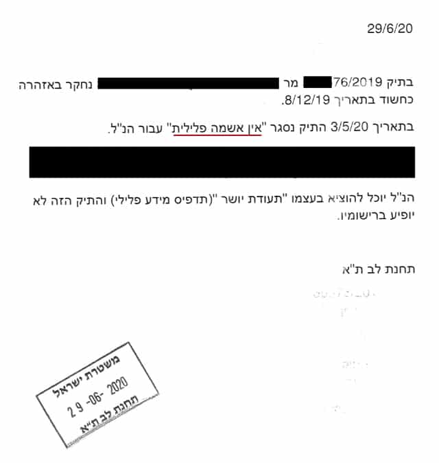 להלן העתק הודעת המשטרה בדבר סגירת תיק החקירה נגד הלקוח מחוסר אשמה פלילית. מפאת החיסיון והשמירה על פרטיותם פרטיהם המזהים במסמכים הושמטו: