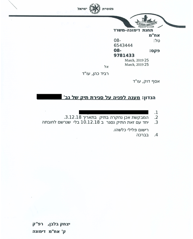 להלן העתק הודעת משטרת דימונה בדבר סגירת התיק נגד לקוחת המשרד מחוסר אשמה פלילית. מפאת החיסיון והשמירה על פרטיותה פרטיה המזהים במסמך הושמטו: