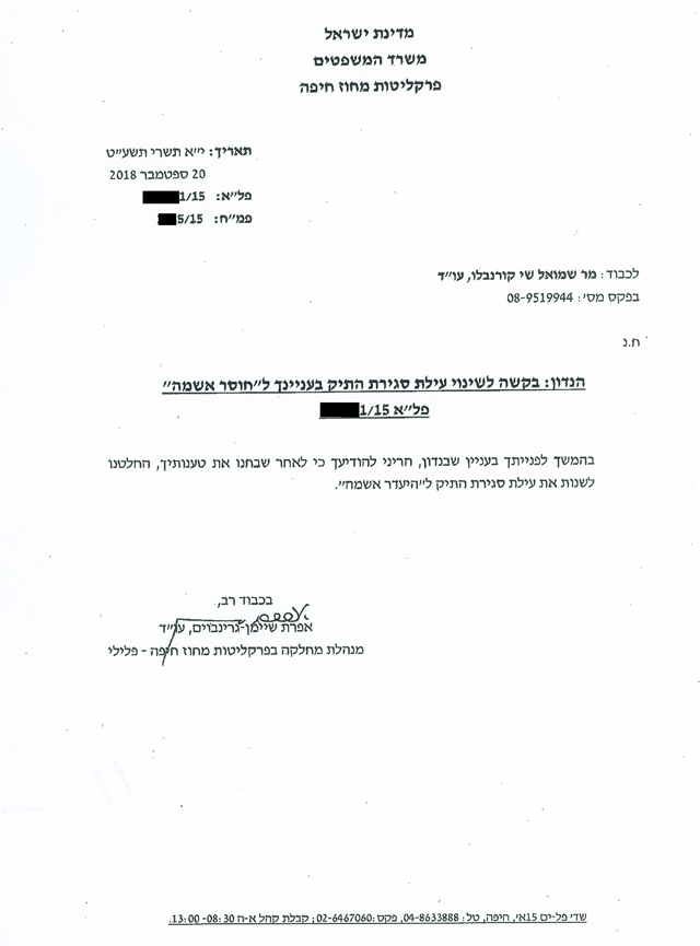להלן העתק ההודעה בדבר החלטת פרקליטות חיפה לסגור את תיק החקירה נגד הלקוח מחוסר אשמה פלילית. מפאת החיסיון והשמירה על פרטיותו של הלקוח פרטיו המזהים במסמך הושמטו: