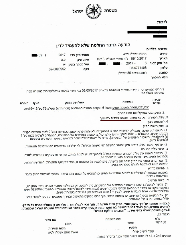 להלן העתק הודעת המשטרה בעניינו של הלקוח. מפאת החיסיון והשמירה על פרטיותו, פרטיו המזהים ומידע חסוי אחר הושמטו: