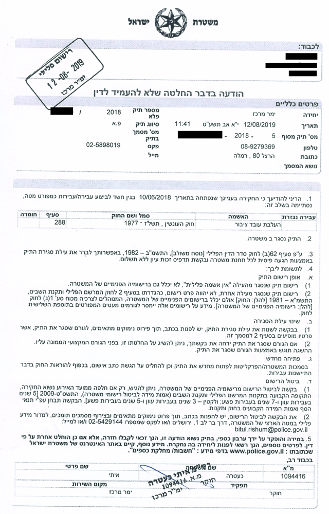 להלן העתק ההודעה בדבר סגירת התיק נגד לקוח המשרד. מפאת החיסיון והשמירה על פרטיותו פרטיו המזהים במסמך הושמטו: