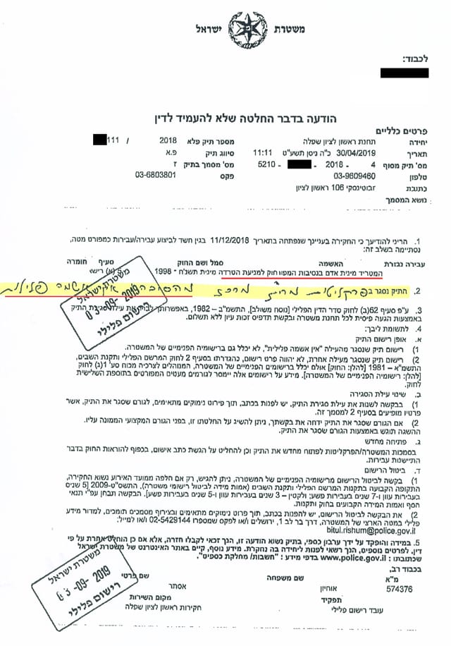 להלן העתק הודעת פרקליטות מחוז מרכז בדבר סגירת התיק נגד הלקוח מחוסר אשמה. מפאת החיסיון והשמירה על פרטיותו פרטיו המזהים במסמך הושמטו: