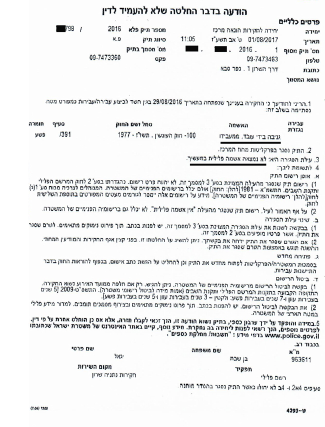 להלן העתק הודעת הפרקליטות בעניינה של הלקוחה. מפאת החיסיון והשמירה על פרטיותה, פרטיה המזהים ומידע חסוי אחר הושמטו: