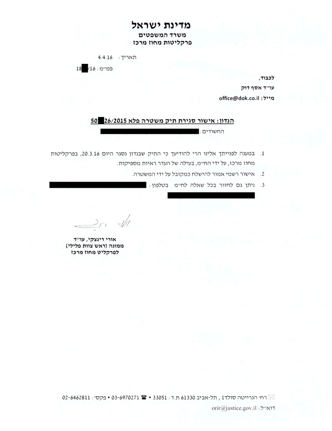 להלן העתק הודעת פרקליטות מחוז מרכז שנשלחה למשרדנו בעניינם של הלקוחות. מפאת החיסיון והשמירה על פרטיותם, פרטים מזהים ומידע חסוי אחר הושמטו: