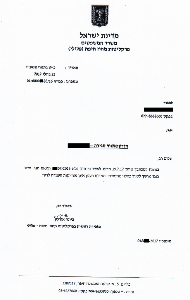 להלן העתק הודעת פרקליטות מחוז חיפה שנשלחה למשרדנו בעניינו של הלקוח. מפאת החיסיון והשמירה על פרטיותו של הלקוח פרטיו המזהים במסמך הושמטו:
