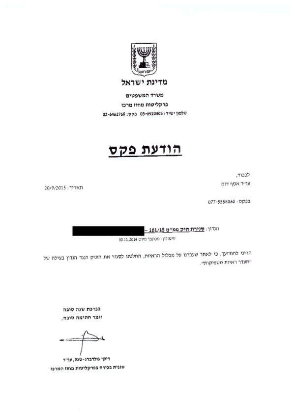 להלן העתק הודעת פרקליטות מחוז מרכז שנשלחה למשרדנו בעניינו של הלקוח. מפאת החיסיון והשמירה על פרטיותו של הלקוח פרטיו המזהים במסמך הושמטו: