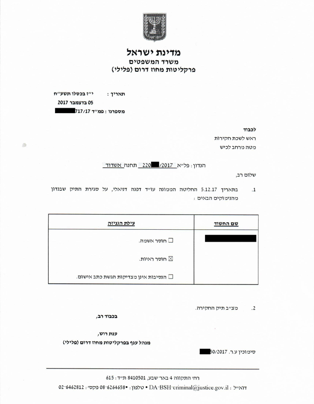להלן העתק ההודעה בדבר החלטת פרקליטות דרום שלא להעמיד לדין את הלקוח שנשלחה למשרדנו. מפאת החיסיון והשמירה על פרטיותו של הלקוח פרטיו המזהים במסמך הושמטו: