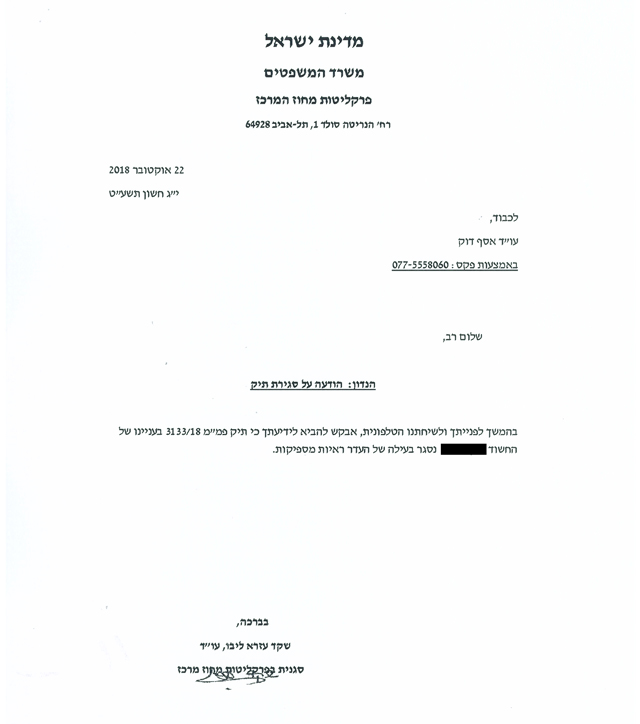 להלן העתק ההודעה בדבר החלטת פרקליטות מחוז מרכז שלא להעמיד לדין את הלקוח שנשלחה למשרדנו. מפאת החיסיון והשמירה על פרטיותו של הלקוח פרטיו המזהים במסמך הושמטו: