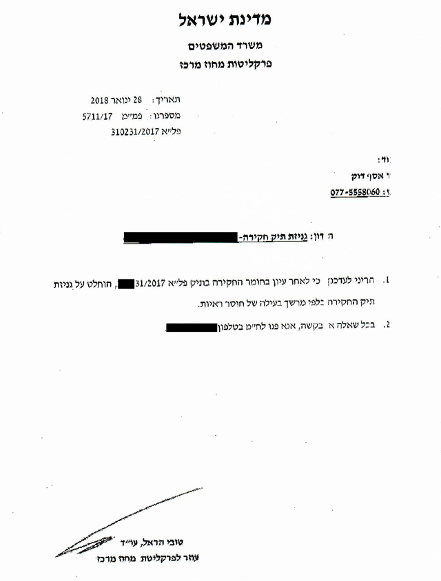 להלן העתק ההודעה בדבר החלטת פרקליטות מרכז שלא להעמיד לדין את הלקוח שנשלחה למשרדנו. מפאת החיסיון והשמירה על פרטיותו של הלקוח פרטיו המזהים במסמך הושמטו: