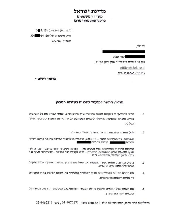 להלן העתק הודעת פרקליטות מחוז מרכז שנשלחה למשרדנו בעניינו של הלקוח. מפאת החיסיון והשמירה על פרטיותו, פרטיו המזהים ומידע חסוי אחר הושמטו: