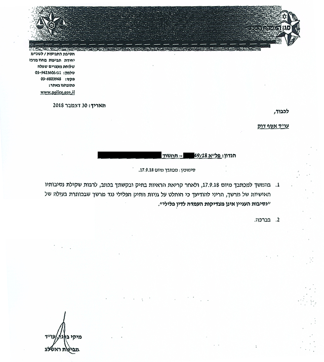 להלן העתק הודעת מדור תביעות מחוז מרכז במשטרה בעניינו של הלקוח. מפאת החיסיון והשמירה על פרטיותו, פרטיו המזהים ומידע חסוי אחר הושמטו: