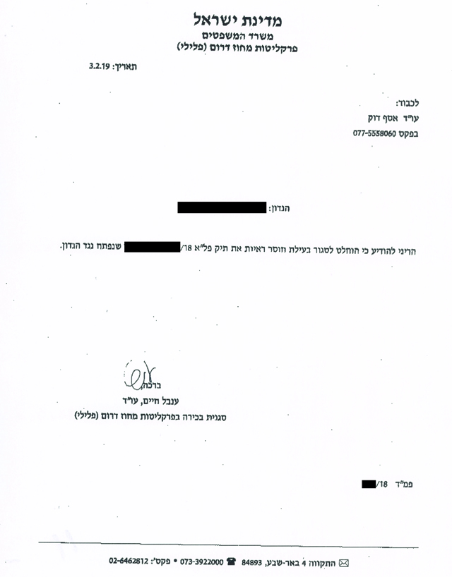 להלן העתק הודעת פרקליטות מחוז דרום בדבר סגירת התיק נגד הלקוח. מפאת החיסיון והשמירה על פרטיותו של הלקוח פרטיו המזהים במסמך הושמטו: