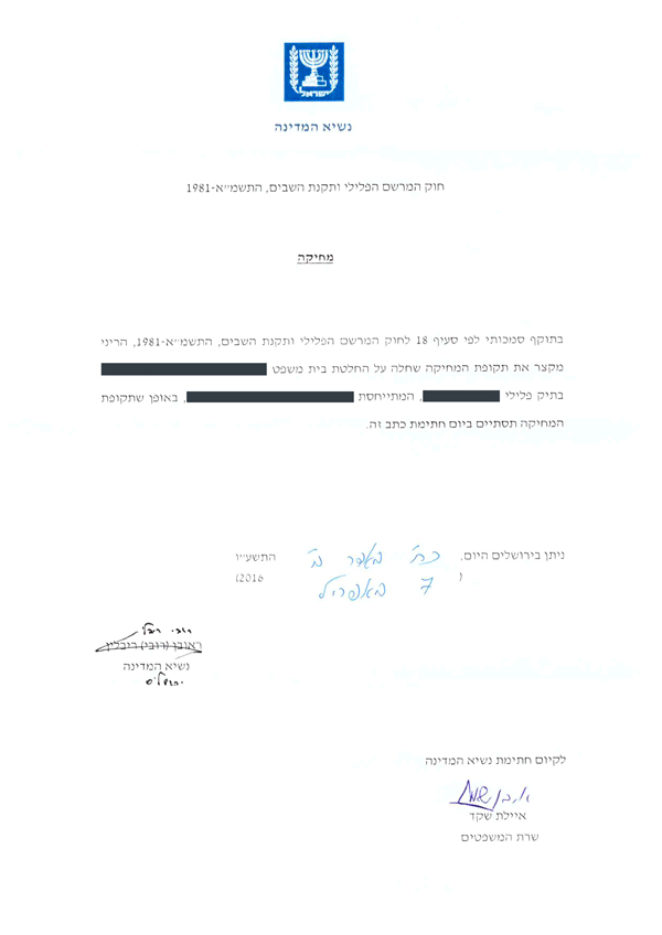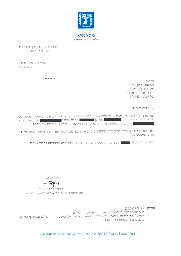 להלן ההודעה שנתקבלה מסגן היועצת המשפטית לנשיא המדינה, עו"ד ג'מאל קדרי, המבשרת כי נשיא המדינה מחק את עברו הפלילי של הלקוח: