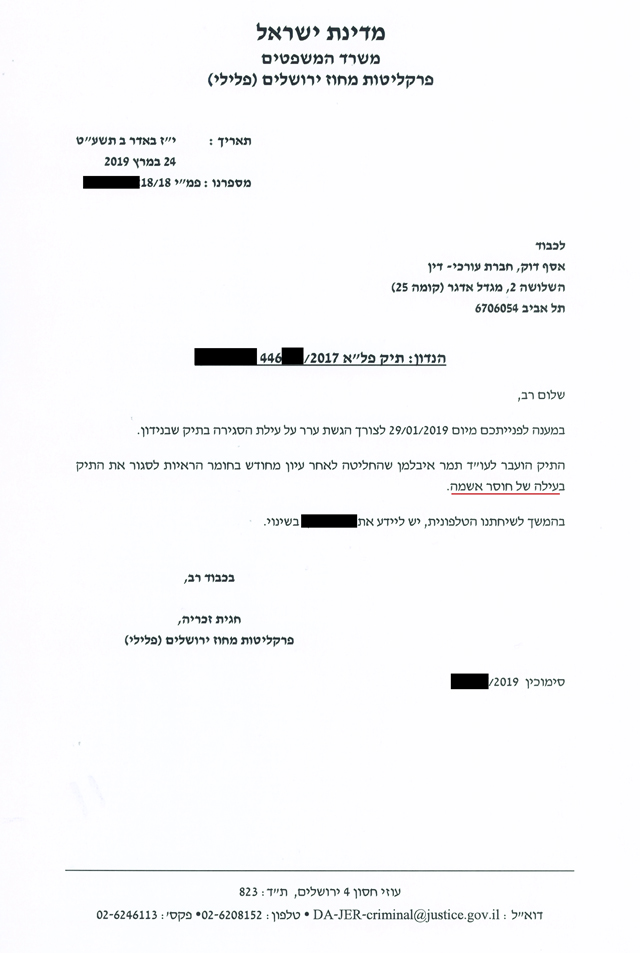 להלן העתק ההודעה בדבר החלטת פרקליטות ירושלים לקבל את ערר המשרד ולסגור את תיק החקירה נגד הלקוח בהיעדר אשמה פלילית. מפאת החיסיון והשמירה על פרטיותו פרטיו המזהים במסמך הושמטו: