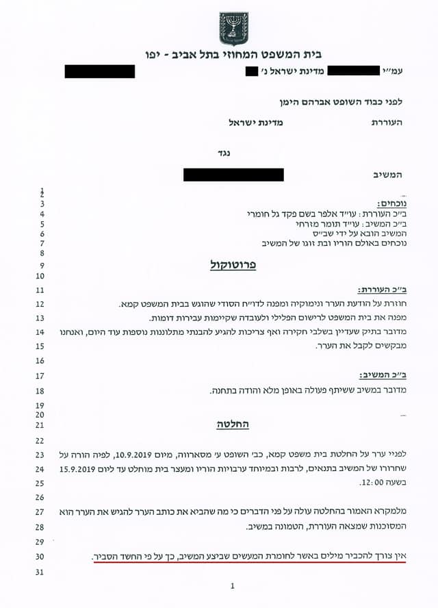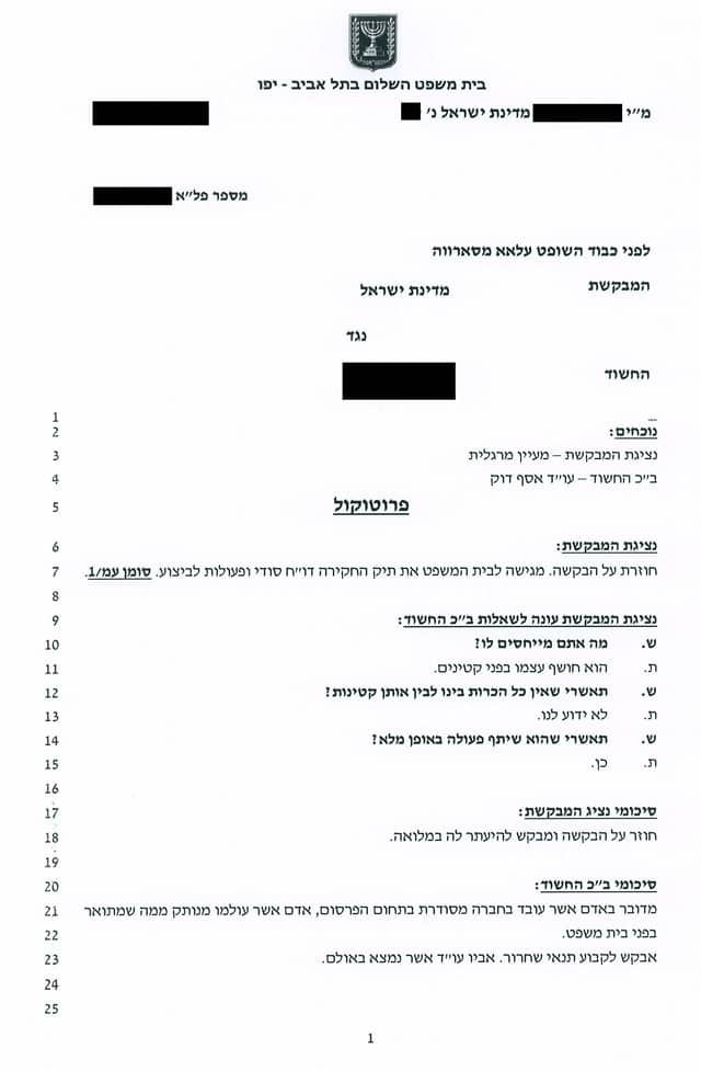 להלן העתק פרוטוקול החלטת בית המשפט המחוזי בתל אביב בערר שהוגש על החלטת השחרור בעניינו של לקוח המשרד. מפאת החיסיון והשמירה על פרטיותו של הלקוח פרטיו המזהים ופרטים נוספים במסמכים הושמטו: