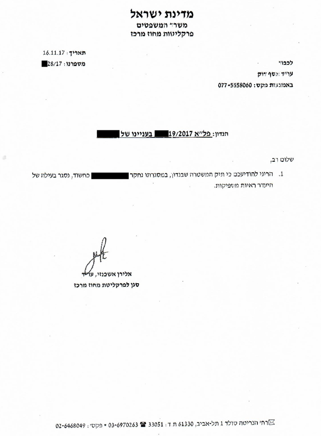 להלן העתק ההודעה בדבר החלטת פרקליטות מרכז שלא להעמיד לדין את הלקוח שנשלחה למשרדנו. מפאת החיסיון והשמירה על פרטיותו של הלקוח פרטיו המזהים במסמך הושמטו: