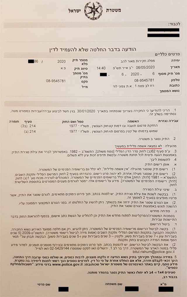 להלן העתק הודעת מחלקת הסייבר בפרקליטות המדינה בדבר סגירת התיק נגד הלקוח מחוסר אשמה. מפאת החיסיון והשמירה על פרטיותו פרטיו המזהים במסמך הושמטו:
